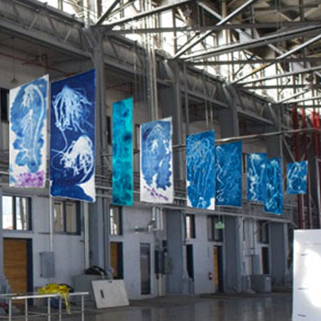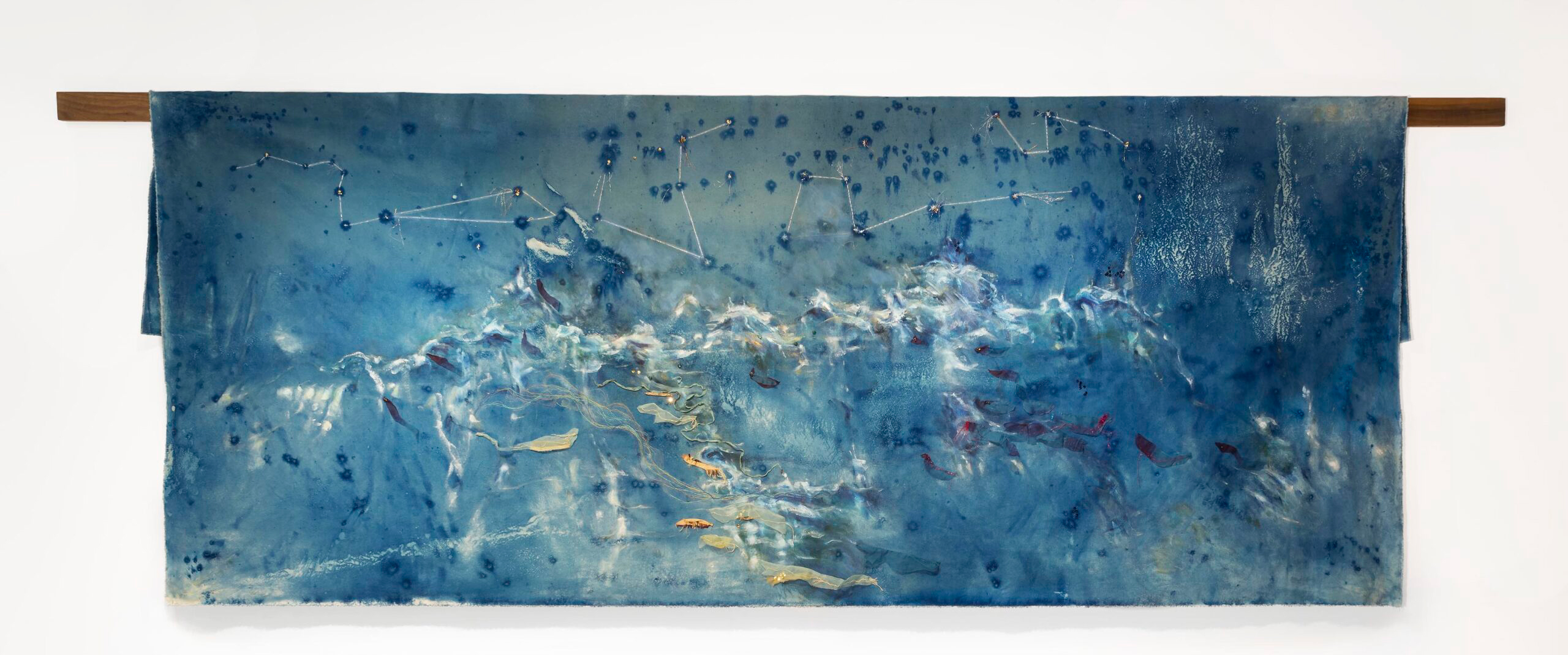 Edge of the Pacific: Bay Perspectives is presented in collaboration with the Ocean Photographer of the Year Award. My large silk installation, Incoming Tide, uses cyanotype to capture the elemental power of sunlight and water. I think of it as a collaboration with natural phenomena.