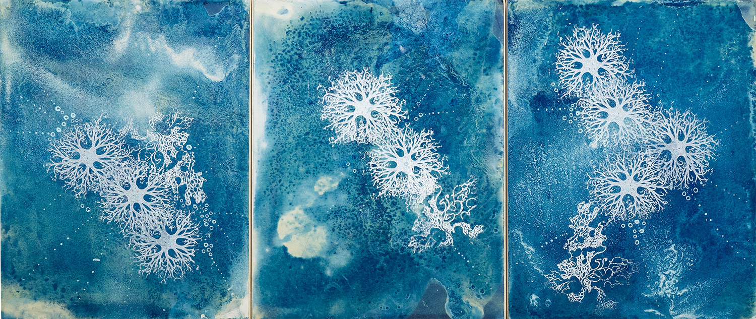 Sea Plant Triptych / Cyanotype, paint, and wax on panel, 24 x 18 in. each, 2021